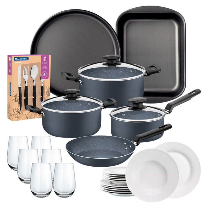 Olla de 16 cm 1,5 litros, sarten de 26 cm 1,8 litros, cacerola de 20 cm 2,9 litros y cacerola de 24 cm 4,9 litros.